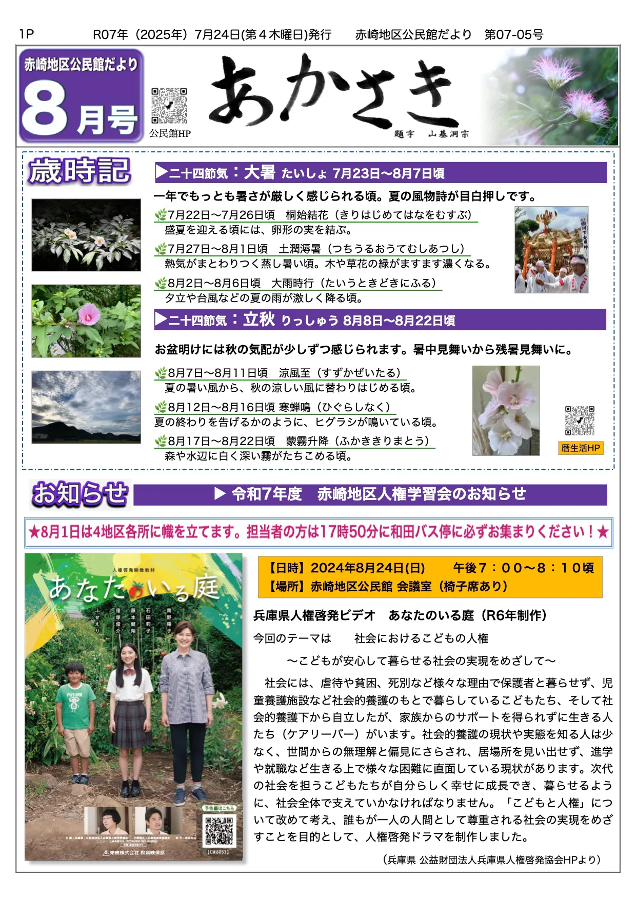 8月24日(日) 午後7:00より、あかさき地区公民館にて人権学習会を行います。